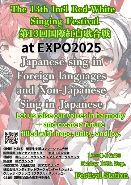 このイベントは、9月19日に大阪関西万博で行われる『第13回国際紅白歌合戦』の選考も兼ねています。This event also serves as a qualifying round for the 13th International Red and White Singing Festival, to be held at the Osaka-Kansai Expo on September 19.